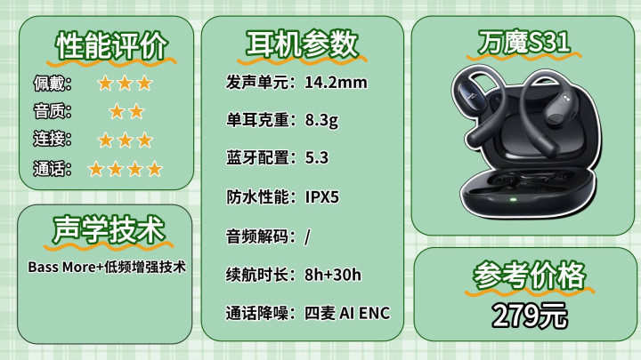 为了帮大家更好选择,我特意整理了专业机构对热门挂耳式耳机的测评图表,如下图所示,之后会给大家进行个人推荐。