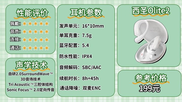 西圣Olite2虽然价格很亲民,但它的配置性能很优秀。吸引了众多专业媒体自发评测,蓝牙5.4芯片,连接速度快,60ms赛事级低延时切换到游戏模式后感觉不到延迟存在,能做到音画同步。18H超长续航,杜绝电量焦虑,还配备行业罕见的全指向性降噪麦克风,它的表现远超同价位其他产品,居于开放式耳机领域的顶尖位置,绝对是你不可错过的性价比之选!