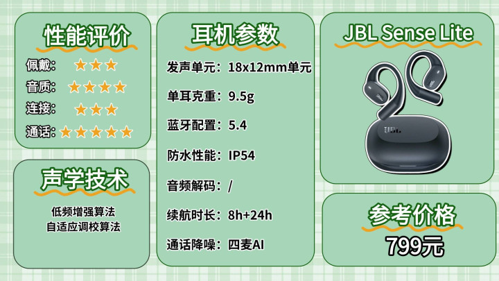 开放式耳机建议选哪种,J BL Sen se Lit e 音悦圈在佩戴体验上,单耳克重为 9.5g,整体属于中规中矩的轻量化设计,长时间佩戴不会太沉重,但材质本身不够亲肤,夏天长时间使用可能会有一定闷热或摩擦感。音质方面,耳机搭载 18×12mm 动圈驱动单元,配合低频增强算法与自适应调校,在流行、人声类曲目上表现清晰饱满,中高频层次感不错,但低频下潜力度有限,对于偏爱强劲鼓点和氛围感的用户来说可能稍显单薄。搭载 蓝牙 5.4,连接稳定且延迟较低,同时支持双设备切换,实用性较高;配合专属 App 可自定义声音曲线并进行播放控制,但部分功能依赖 App,使用上会有额外学习和安装成本。