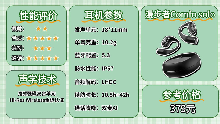 开放式耳机建议选哪种,漫步者 Comfo Solo 单耳克重10.2g,耳机佩戴贴合耳廓,但因重量偏大,连续佩戴两小时以上会感到耳背和耳甲腔处轻微酸胀,运动时稳固性一般,偶尔会出现轻微晃动。音质方面,18×11mm宽频强磁复合单元整体表现均衡,中高频清晰,人声自然,但低频厚度不足,听电子乐或节奏感强的流行音乐时缺少力度感和现场感。功能配置上,蓝牙V5.3支持双设备连接和充电仓灯光控制,操作直观易用,但在复杂环境下蓝牙稳定性略欠,偶尔会出现短暂断连,对于追求高稳定性的用户略显不足。