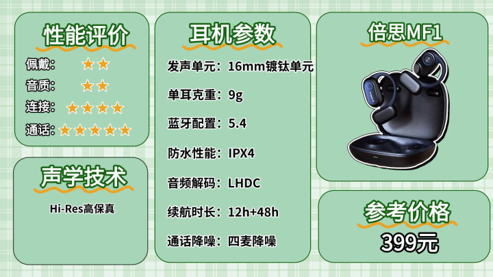 开放式耳机建议选哪种,耳机单耳重量仅9克,佩戴轻便舒适,舒适气囊设计增强了贴合感,长时间使用也不易疲劳。充电盒稍大,携带时存在感明显,便携性略受影响。音质上,16mm镀钛单元带来中高频清晰表现,但低频下潜不够有力,整体低音冲击力不足,同时防漏音一般,音乐在安静环境下可能有外泄现象。功能配置方面,蓝牙5.4连接稳定,支持双设备同时使用,四麦克风降噪保证通话顺畅,续航单次12小时,总计48小时;AI智控APP功能齐全,可调用语音助手,但对不熟悉手机操作的用户略显复杂。